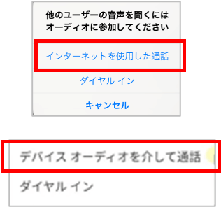 2.以下のメッセージが出た場合は、「インターネットを使用した通話」「デバイスオーディオを介して通話」を押す。*他のメッセージが出た場合も、原則「許可」「OK」「了解」を選択する。