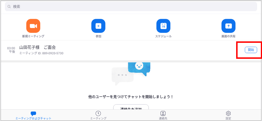 1.ログインし、画面に表示されているミーティング予定の「開始」をクリックする。