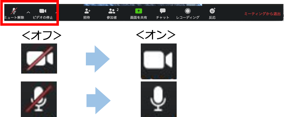 1.メニューバーのマイクとビデオがオフになっている場合は、オン切り替える(クリックするとオンとオフが切り替わる)