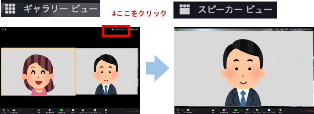 2.画面が2つに分割(ギャラリービュー)されている場合は、「スピーカービュー」をクリックして、面会相手がアップになるように切り替える。